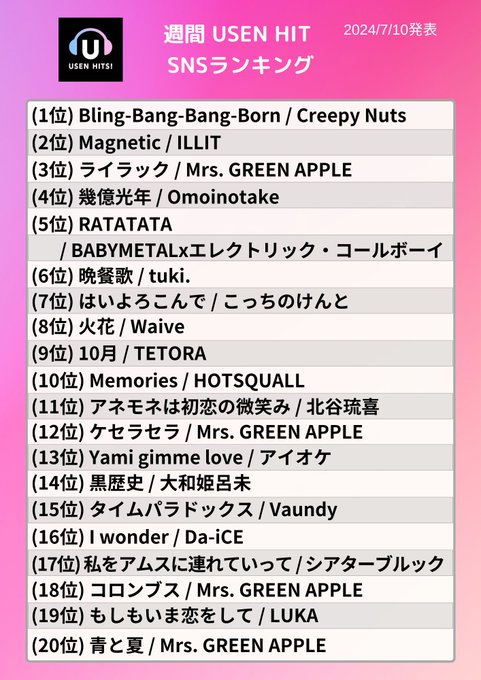 — USEN HITS!(有線放送) (@USEN_HITS) July 10, 2024