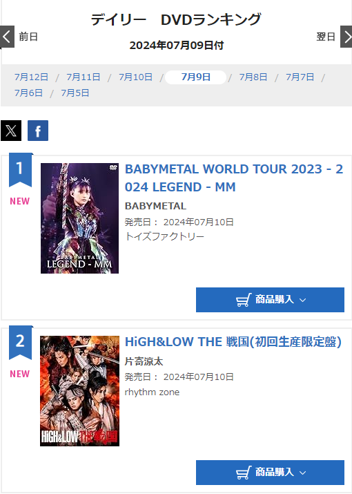 【#オリコンランキング】7/9付 デイリーDVDランキング更新!#デイリーDVD 1位はBABYMETAL WORLD TOUR 2023 - 2024 …