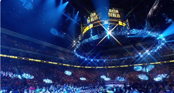 分かりづらいけどWWE Bash In Berlinの会場でテーマ曲のRATATATAが流れてる様子