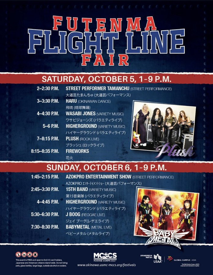 またBABYMETALの日は混雑が予想されるって書いてある#BABYMETAL #普天間フライトラインフェア2024https://t.co/RZILDEhefd pic.twitter.com/O4LP7s82yh— ma-metal🦊🤘|サマソニ東京|BABYMETAL MOVIE|テレ朝ドリフェス|普天間 (@mametal3) September 26, 2024