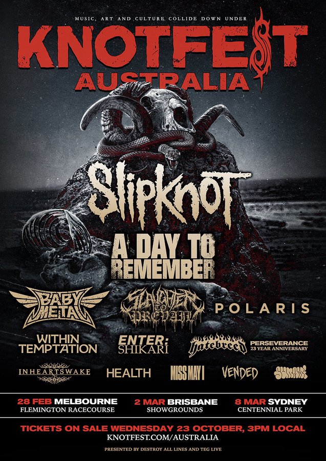 Knotfest Australia は、Slipknot、A Day To Remember、BABYMETAL、Polaris、Within Temptation、Enter Shikari、Hatebreed、In Hearts Wake、HEALTH、Miss May I、Vended、Sunami など、大勢のアーティストを擁して 2025 年に再登場します https://t.co/U7jsSolnOI