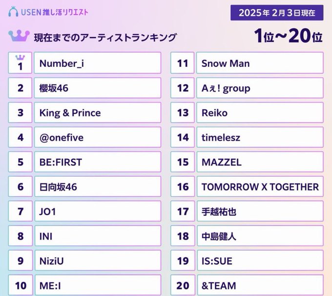 (2025年2月3日(月)現在までのアーティストランキング1位~100位を公開。21位~は特設サイトにて)… pic.twitter.com/PzsTH0RLUs— USEN HITS!(有線放送) (@USEN_HITS) February 3, 2025