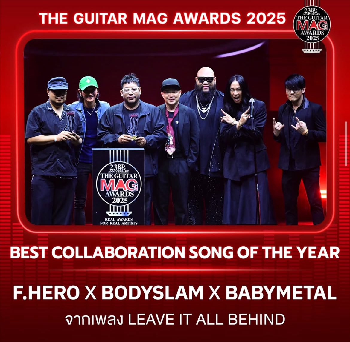 「LEAVE IT ALL BEHIND」の楽曲が、タイ最大の音楽賞 「THE GUITAR MAG AWARDS 2025 : REAL AWARDS FOR REAL ARTIST」 において、「Best Collaboration Song Of The Year(年間最優秀コラボレーションソング)」 を受賞しました。