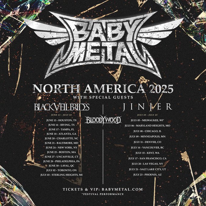BABYMETAL NORTH AMERICA 2025 TOUR with special guests @blackveilbrides ,@jinjerofficial and @Bloodywood2 on select dates. Pre-sale tickets and VIP begins TODAY at 12:00pm ET, sign up at https://t.co/QhT82JdPHt to receive pre-sale code. General on-sale Friday March 21 at 10:00am… pic.twitter.com/YIWs7KJPHV