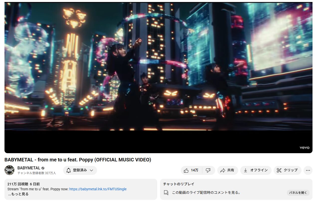 BABYMETAL – from me to u feat. Poppy (OFFICIAL MUSIC VIDEO) youtube再生数 2,086,545回、コメント数 9,349。本日の再生数 185,377回、コメント数 218。