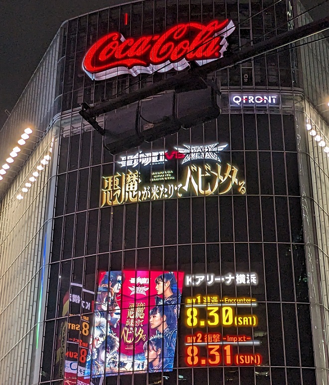 渋谷スクランブル交差点で信号待ちをしている時に、何気なく上を見上げたら「聖飢魔Ⅱ vs BABYMETAL 〜悪魔が来たりてベビメタる〜」の告知画像が映し出されていた。ここで宣伝されているとは知りませんでした。 pic.twitter.com/ohm1Z3oybb