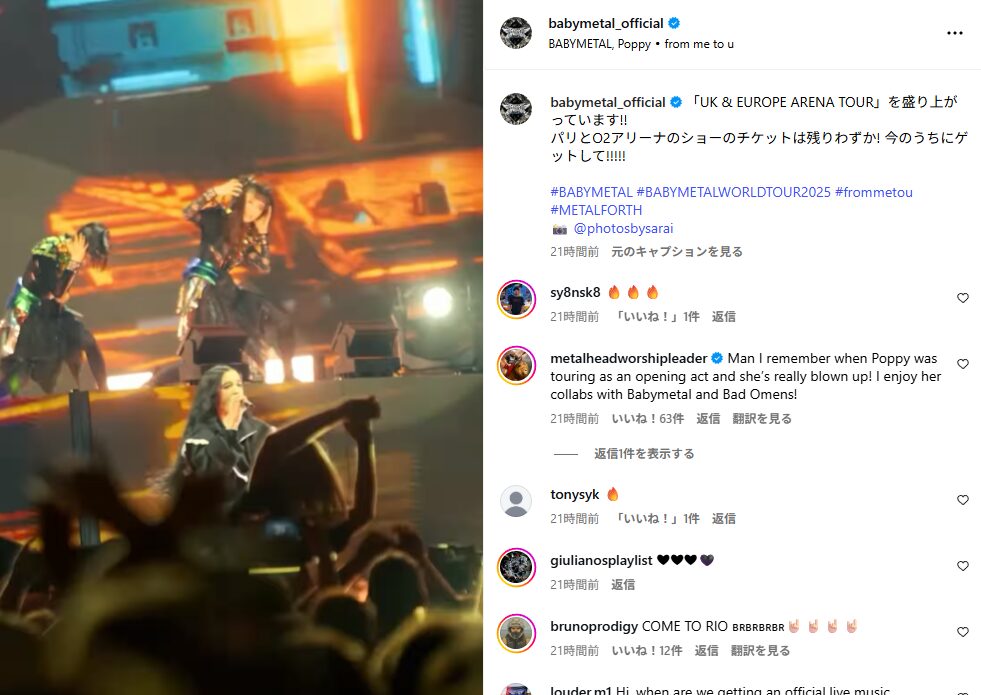 「Rocking our way through the “UK & EUROPE ARENA TOUR”!!Very few tickets left for the Paris and O2 Arena shows! Get them while you can!!!!!(「UK & EUROPE ARENA TOUR」、盛り上がってます!パリ公演・O2アリーナ(※ロンドン公演の会場)公演のチケットは残りわずか!今のうちにゲットして!)」と綴り、アメリカの人気歌手・Poppyとのコラボレーション楽曲「from me to u」を、Poppy本人とともにパフォーマンスしているライブ風景の動画をアップした。