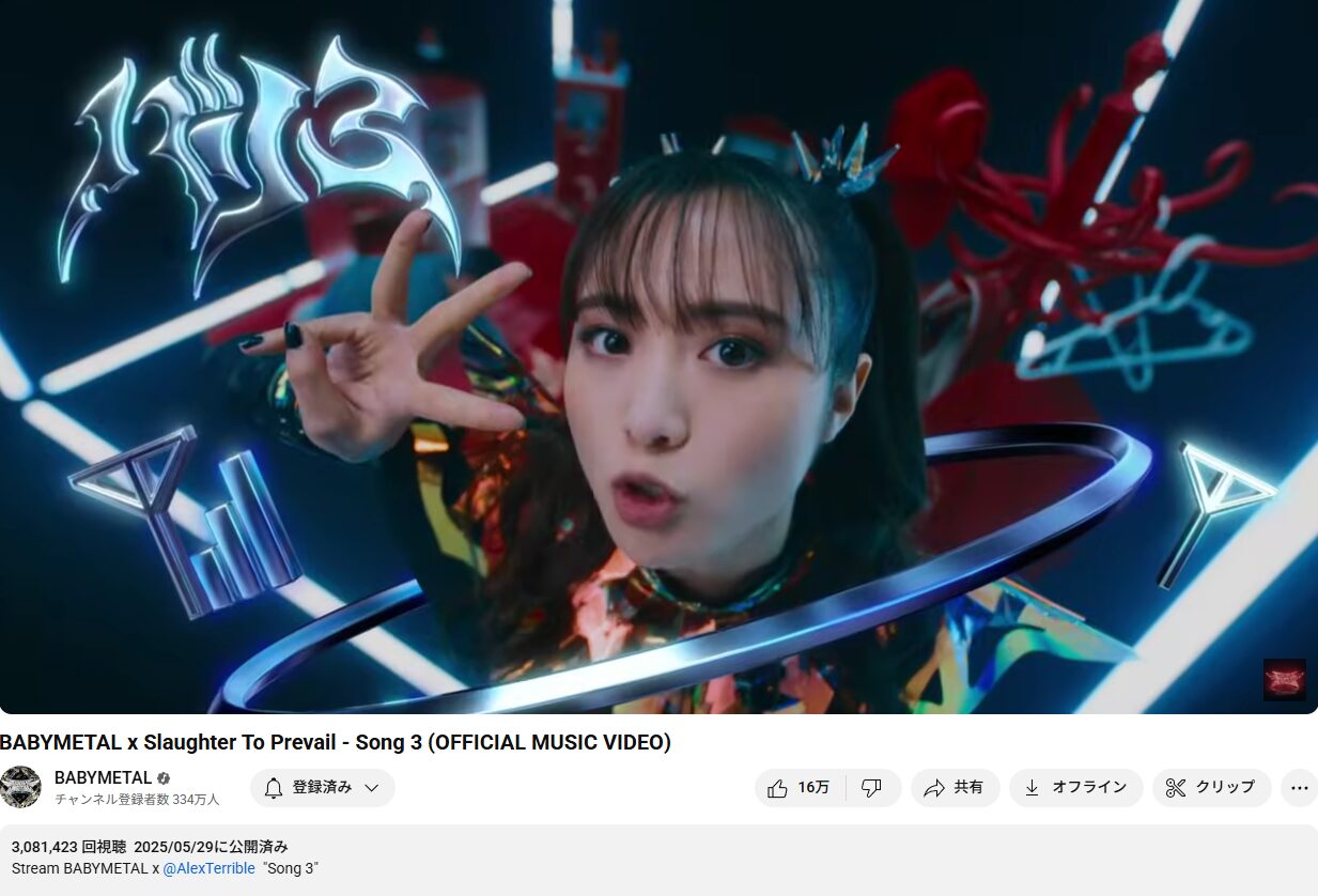 BABYMETAL x Slaughter To Prevail – Song 3 (OFFICIAL MUSIC VIDEO) youtube再生数 3,070,774回、コメント数 9,163。