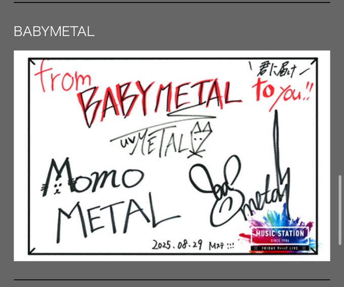 ミュージックステーションの公式サイトで8/29出演者のサインが公開、BABYMETALのも載ってる