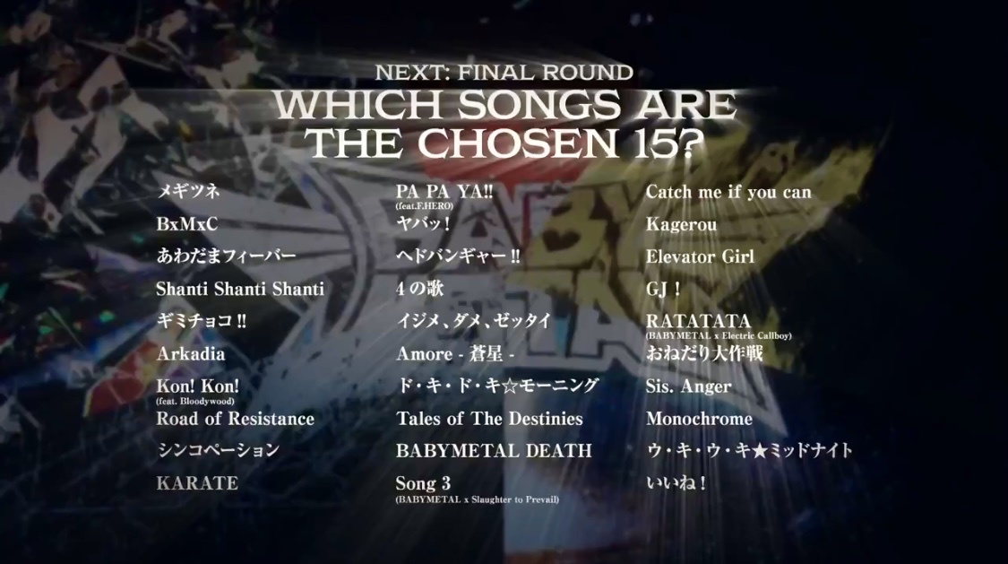 15 LEGEND SONGS TOURNAMENTのNEXT STAGEいつ始まるんだ?と思ってたらそういうことか!自分が選んだ15曲のうち8曲が勝ち進んでる!でもNRNRがない…😢10日の午前中はグッズ列並んでるだろうから投票は参加出来なそうだな。#15LEGENDSONGSTOURNAMENT #15BABYMETALYEARS #BABYMETAL #POPUPストア https://t.co/jkMe0R2KbN